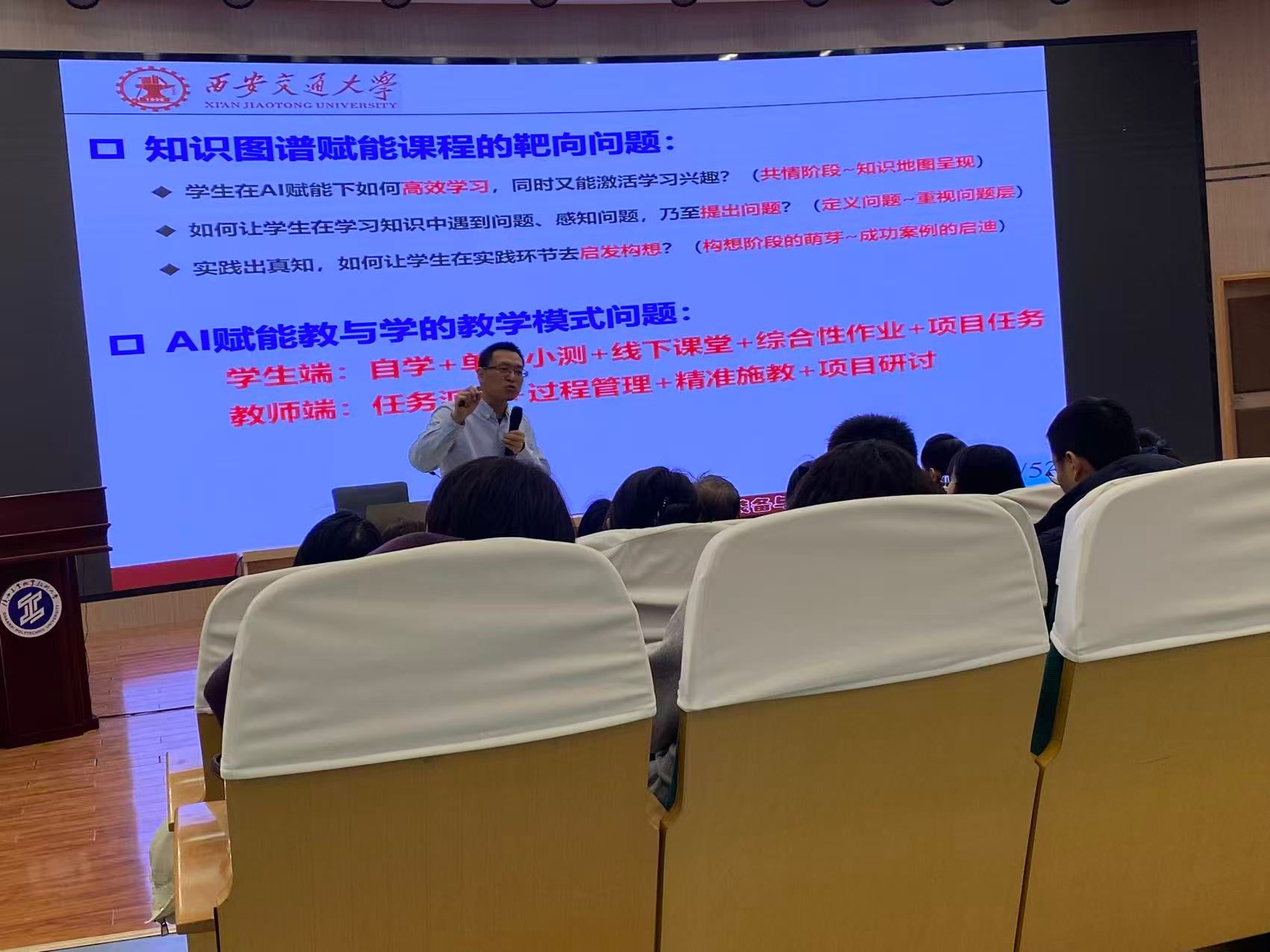 本次活动在陕西工业职业技术大学学术会堂举行,围绕知识图谱的建设与应用和新工科背景下的教学创新展开。首场名师报告由西安交通大学徐亮教授主讲,他以《数智化背景下基于知识图谱和AI重构课程的教学创新与初步实践》为题,从课程建设思路、建设期工作、应用期探索三个维度,深入阐述了从数字化向数智化转型的路径,深刻剖析了课程教学变革的内在逻辑,并系统分享了教学改革的方法与实践路径。